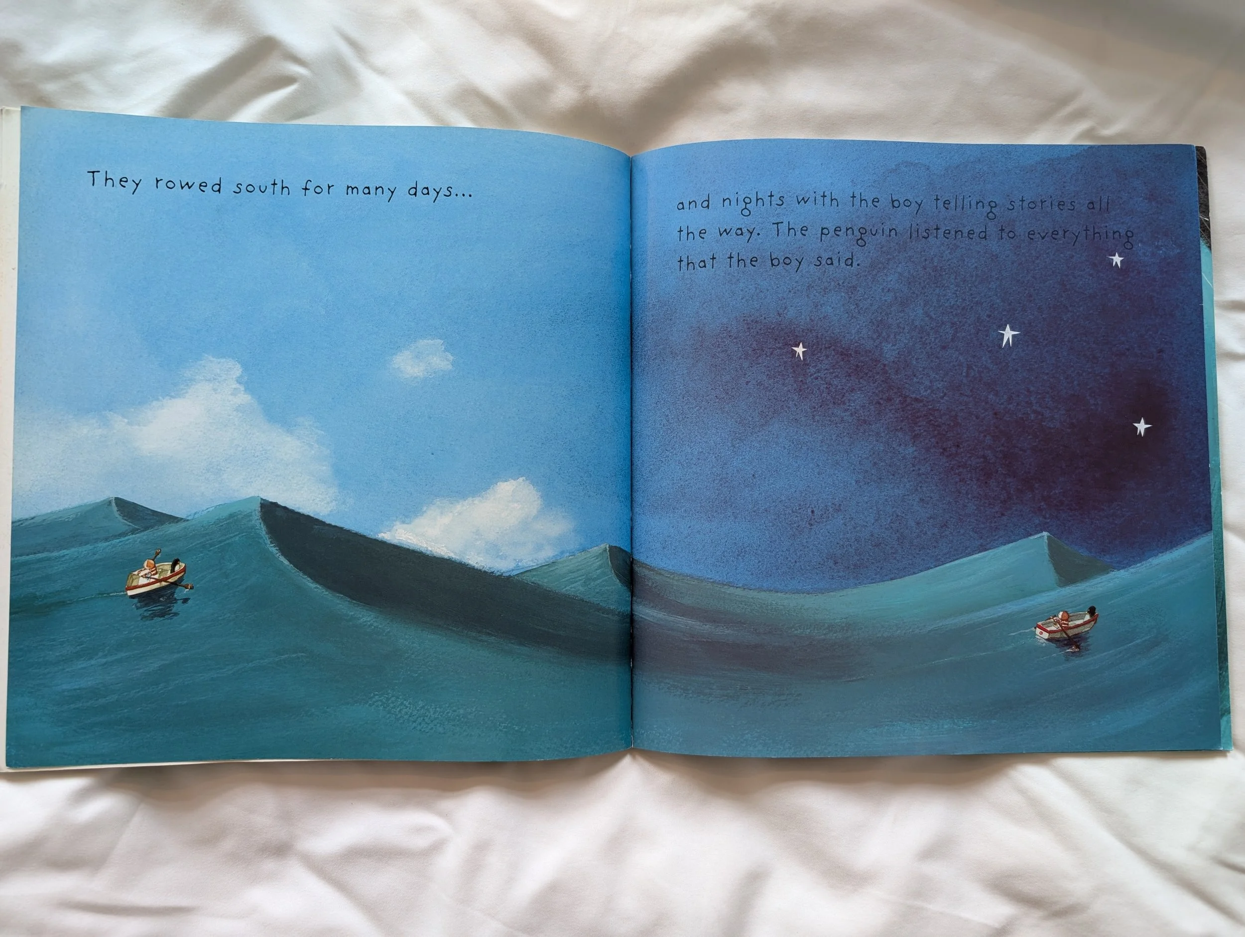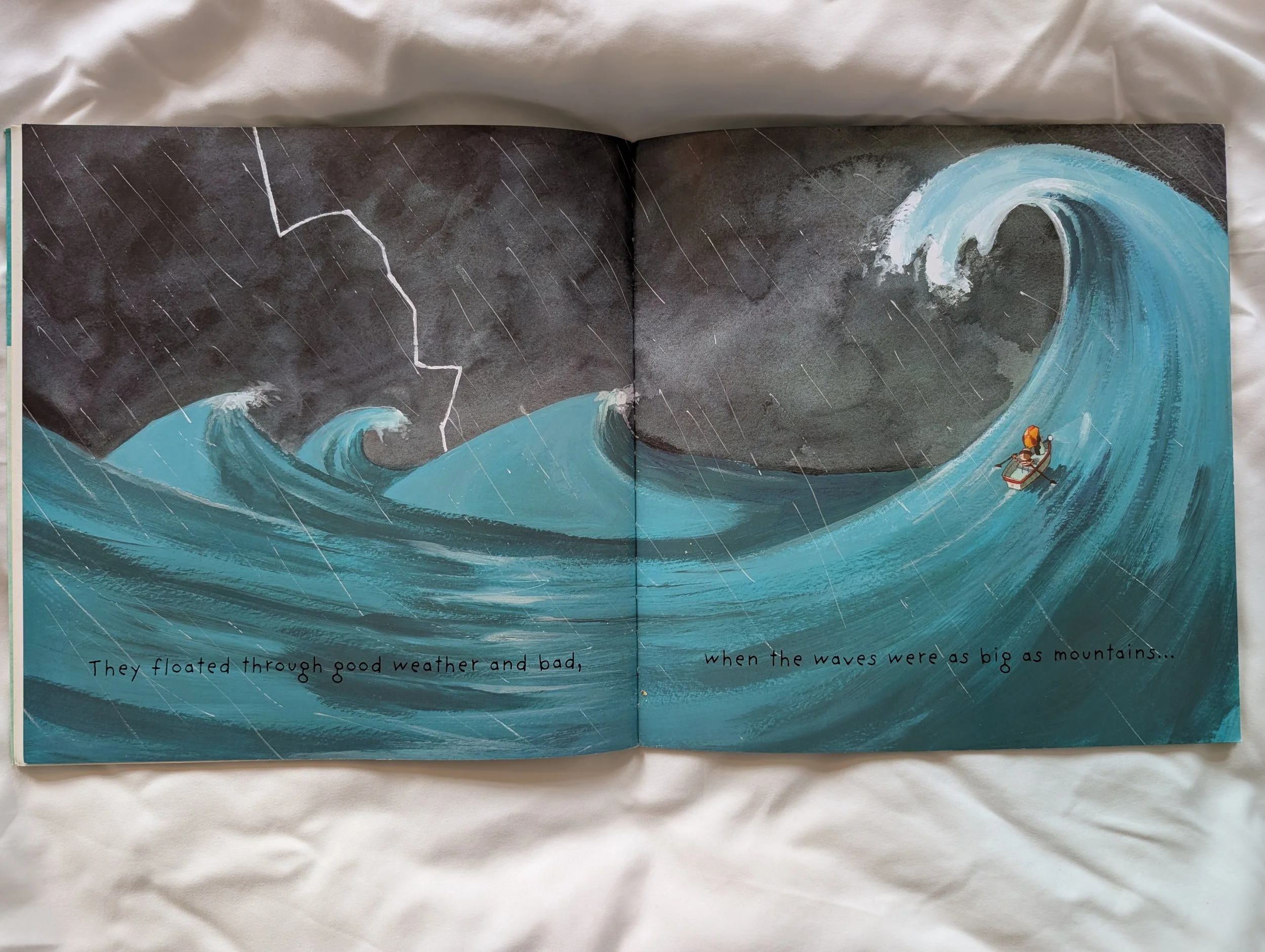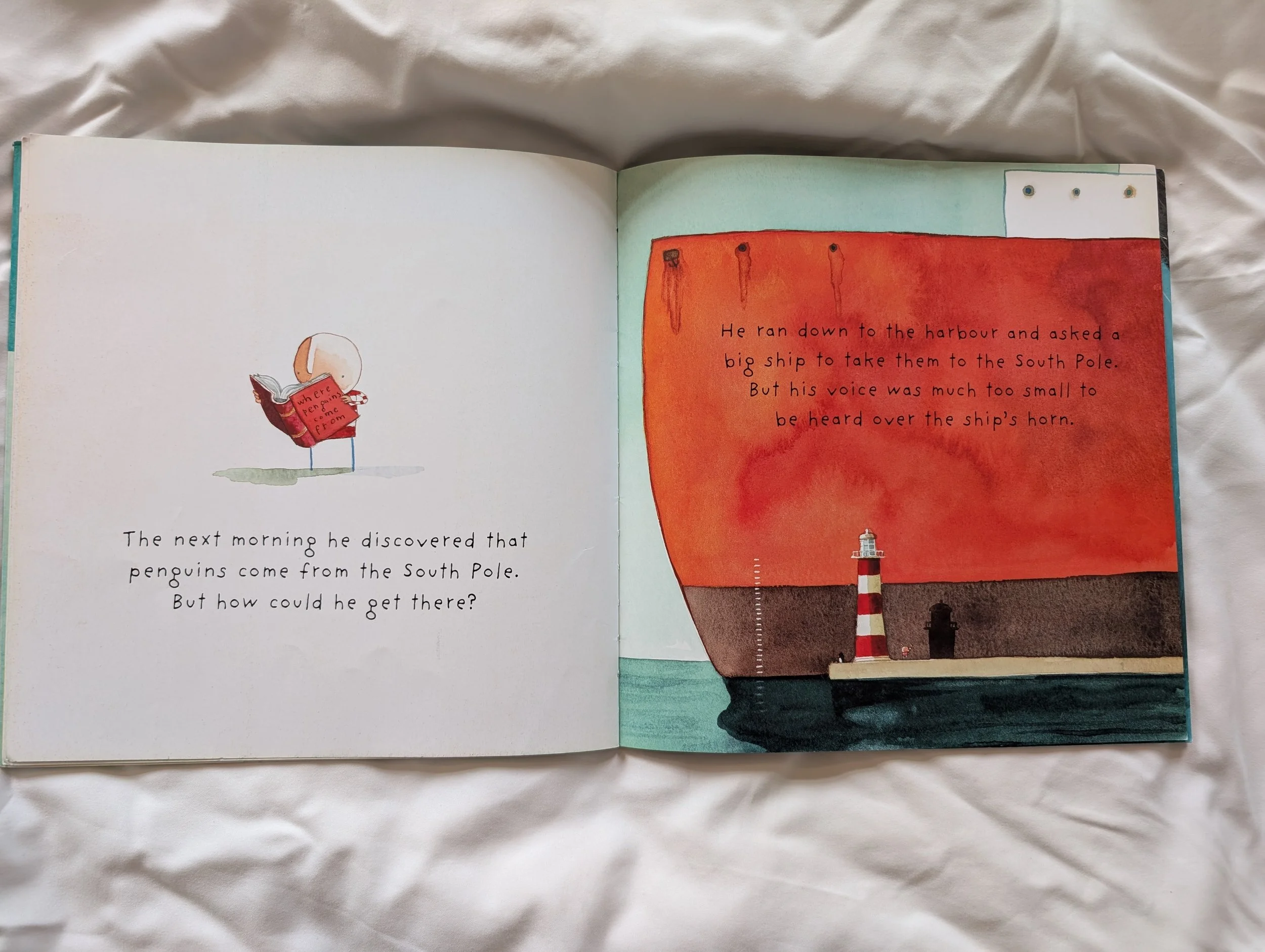 on the left-hand page, but for the right-hand page, the uneven texture on the ship makes legibility a bit trickier than it needs to be. Space for the text has been considered and left, and it is aesthetically cohesive. The texture is part of Oliver Jeffers’ art style, but I would suggest reducing it entirely behind the text.